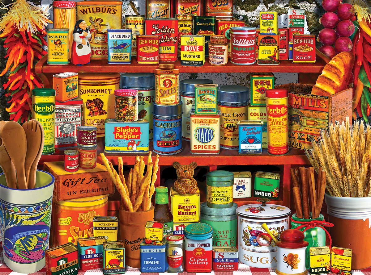 Lewis T. Johnson has assembled this delightful collection of spice, tea and cocoa tins, pasta, bread, grains, red peppers, sugars, and collectibles. Blue Ribbon Mace, Oak Hill Tumeric, Ward Allspice, Dove Mustard and Nabob Oregano could all add their flavors to your favorite recipe. 1,000 piece puzzle with a finished size of 24” x 30”.