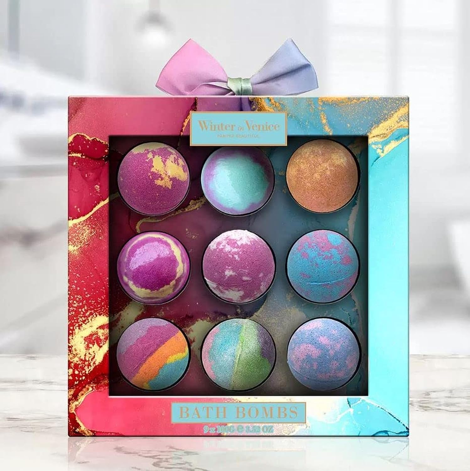 DescriptionWinter In Venice Bath Bombs 9 Piece Gift Set Winter In Venice Bath Bombs 9 Piece Gift Set comprises 9 delightful Bath Bombs which are vegan friendly and infused with natural fruit and plant extracts. Indulge and enliven your bath time with this invigorating collection of bath treats, which also makes an ideal gift this Christmas. Contents: Redcurrant & Fig Bath Bomb, 100g Pistachio & Wild Honey Bath Bomb, 100g Sandalwood Bath Bomb, 100g Pomegranate Bath Bomb, 100g Lavender & Amber Bath Bomb, 100g Rose & Lychee Bath Bomb, 100g Bergamot & Jasmine Bath Bomb, 100g Almond & White Peach Bath Bomb, 100g Rich Plum Bath Bomb, 100g Natural Fruit & Plant Extracts Individually Fragranced Bath Bombs Vegan Friendly 9 Piece Set (900g)