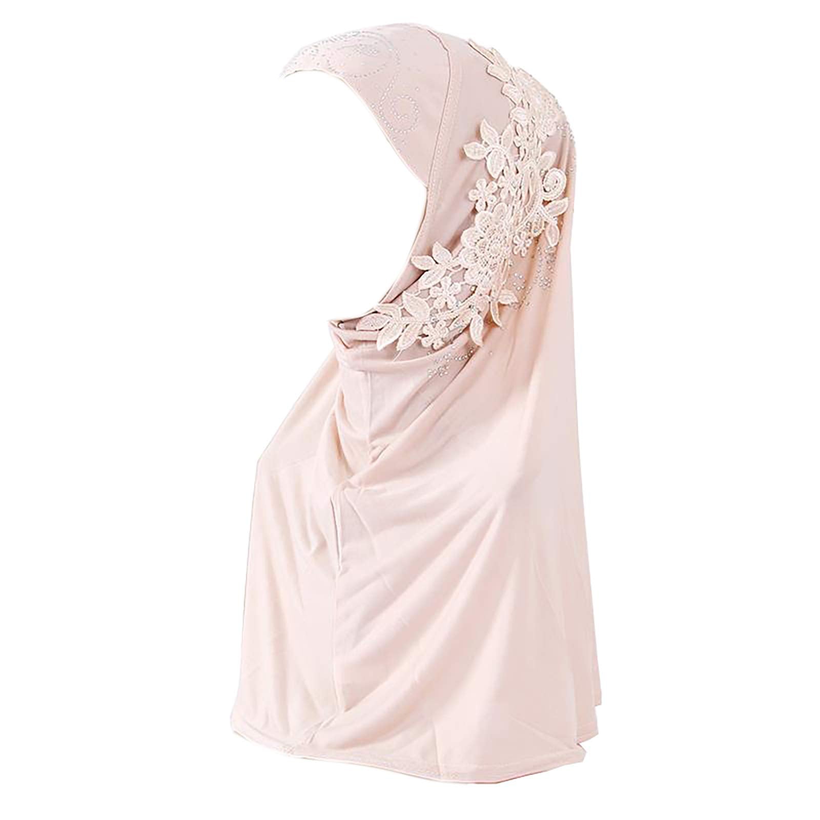 Women One Piece Muslim Hijab Lace Applique Head Wrap Scarf Shawl with Rhinestones (Beige)