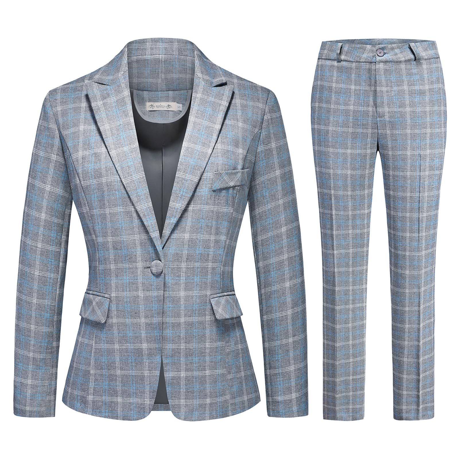 Womens 2 Piece Plaid Suits Set Business Office One Button Blazer Jacket Casual Long Sleeve Pant Suit Set, Color Choice:Pink/Apricot/Blue/Grey/White/Deep Grey, Collar:lapel, Sleeve Type: Long sleeve, Closure type:Button, Package Includes: 1x womens suit set