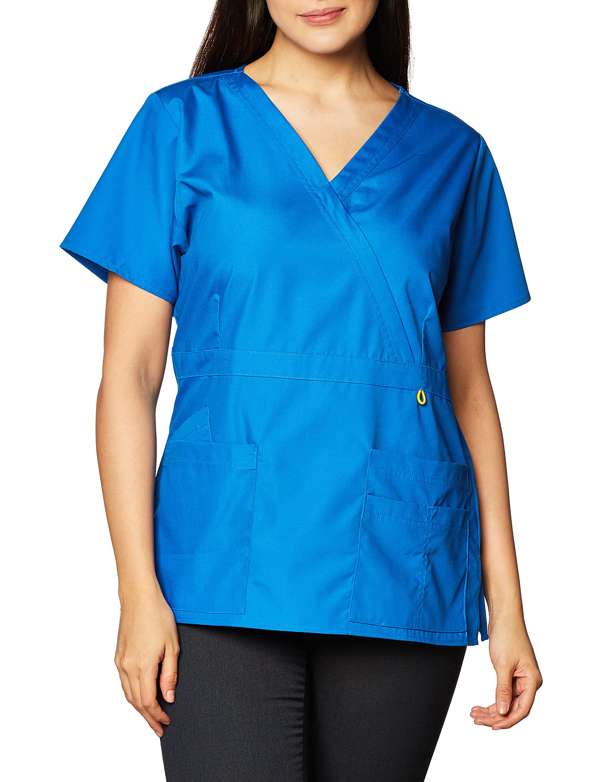 DescriptionThe golf, wonderwink lady fit mock wrap top, 2 large front patch pockets, one signature wonderwink pocket and one peek-a-boo pocket, signature id bungee loop and invisible 3 part accessory loop, front mock belt with bust darts for shaping, sporty stitching at neckline and pockets, tagless neck