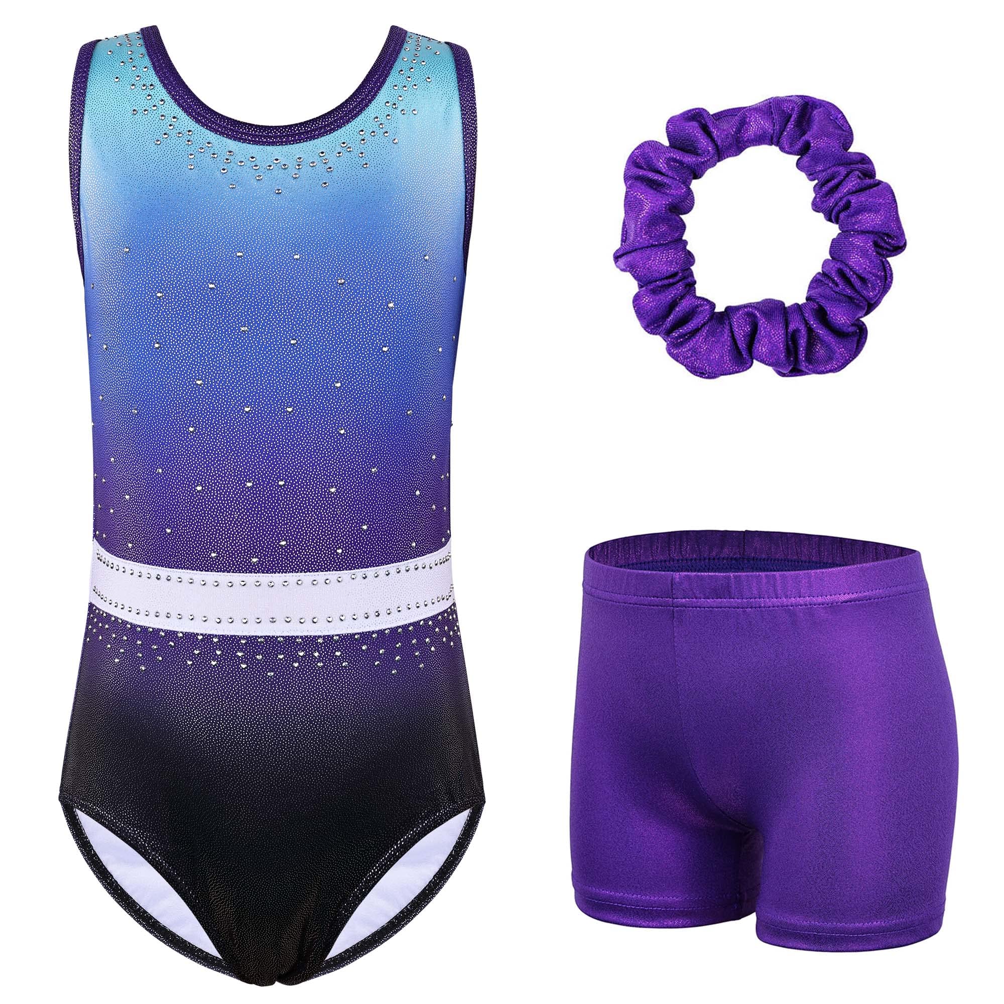XFGIRLS Gymnastics Leotards for Girls Sleeveless Sparkle Leotard Ballet Dance Tumbling Athletic Shorts Blue-Purple 12A