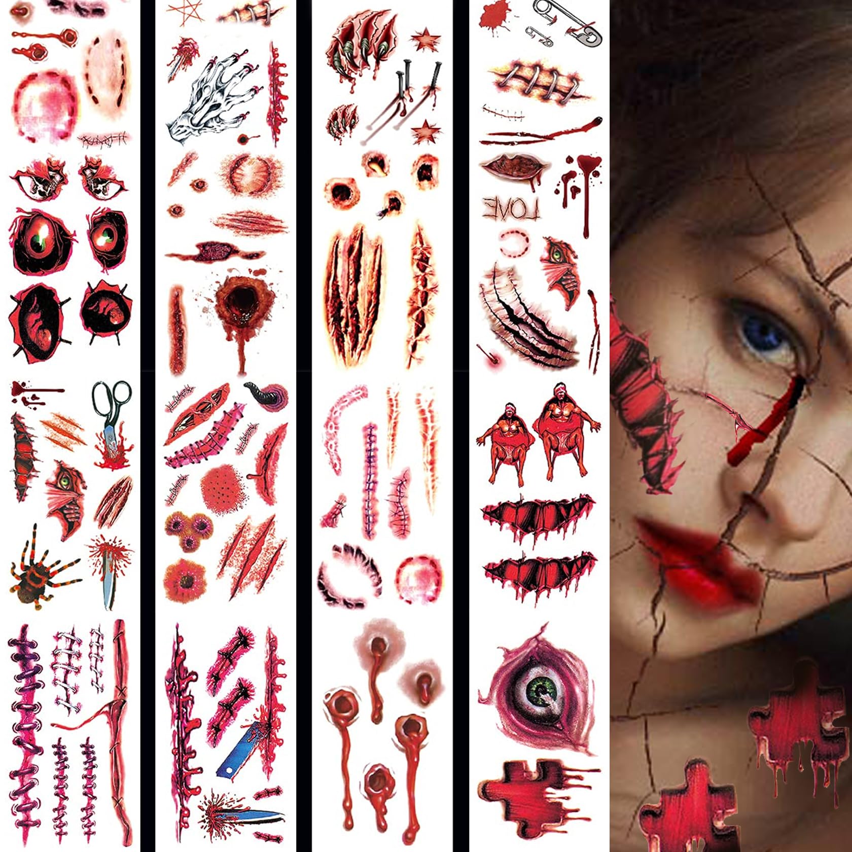 XiaoTu 20 PCS Halloween Scar Temporary Tattoos,Halloween Makeup Kit for Adults Women Men,Realistic Fake Scars Bloody Wound Stitch Horror Zombie Makeup Sticker Tattoos Cut Waterproof Tattoo Stickers Sets