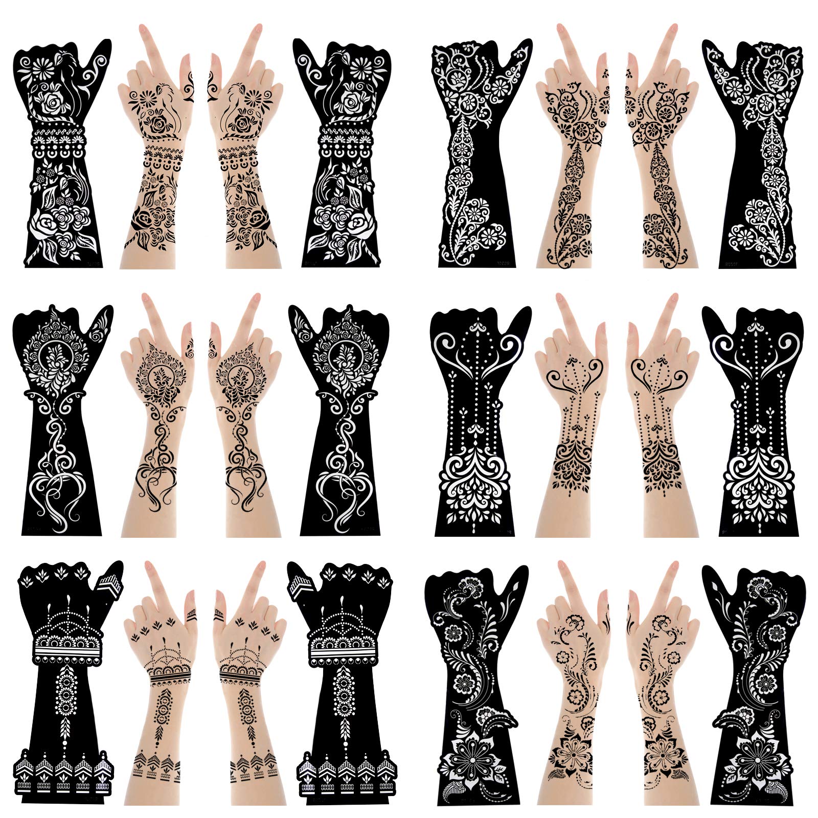 Product description Using Method: 1.Choose the design you want and peel off white backing. 2.Make sure the skin is dry before applying the sticker. Place the sticker on the skin in the direction you want and press firmly, making sure there are no wrinkles or blebs, remove the clear film from the sticker. 3.Use the brush appliator in the bottle, and apply the glue on the skin showing through the stencil. 4.Remove the stencil after approximately 1-2 minutes. 5.Use the small cosmetic brush to apply the glitter to the areas with glue. Make sure glitter completely covers all areas with glue. (You may mix colors) 6.Use the large cosmetic brush to press down the glitter, after the glitter has been firmly set, brush away any excess glitter. 7.Glitter tattoos will last approximately one week under normal conditions.keep skin dry. Note: The package contains only the template, excluding Henna paste, glitter, and glue.