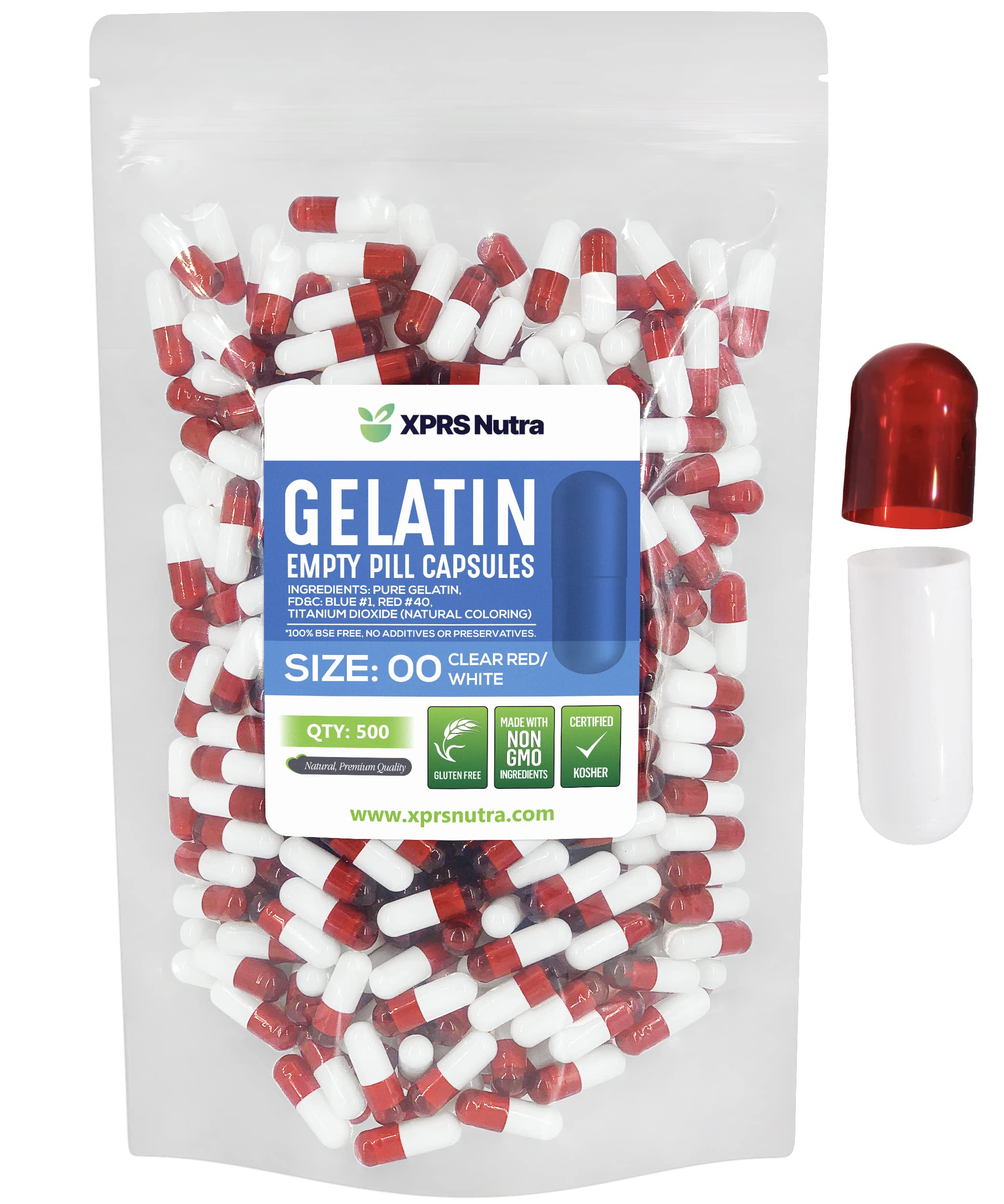 Premium Size 00 Empty Capsules Do you fill your own dietary supplements, nootropics, herbs or powders? Do you want to budget your money by buying top quality empty pill capsules in bulk? These XPRS Nutra (Capsules Express) easy-fill easy-snap lock size 00 pill capsules are perfect for DIY easy to swallow dietary pills capsules whether you fill them manually or with a capsule filler. Size 00 capsules hold 600 mg to 1100 mg of your desired powder or supplement. Because each powder, vitamin, or medicine has different grain sizes and weights, the total fill volume varies from ingredient to ingredient. Dissolves Rapidly Each pill capsules empty pill casing is made from 100 percent bovine gelatin without preservatives or additives. You can use a capsule filling machine or fill them manually They dissolve quickly in your GI tract for better absorption and greater bioavailability. Our capsules are clean and have no taste, fragrance or odor. Secure Click Safe Design Unlike many bovine based capsules, ours have a built in click shut design. That's important because it protects the contents of your pill from spilling out or getting damaged from moisture buildup or stale air contamination. Our capsules are colored to make manually filling as quick and easy as possible. Choose our 500 individual gelatin capsules and save more money the more gel caps you purchase at once. The 500 count fillable gel capsules bag is the best bang for your buck!