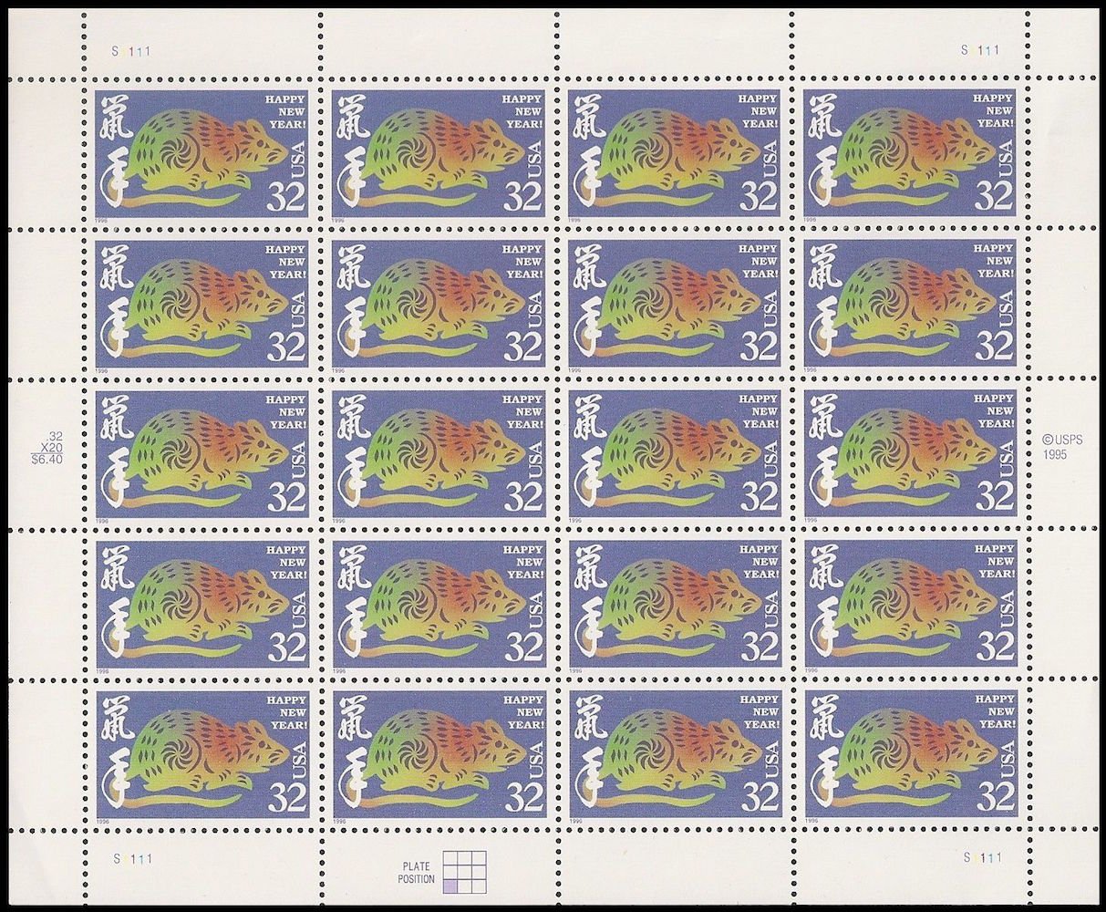 These “Year of the Rat” stamps were issued on February 8, 1996, in San Francisco, California. Artist, Clarence Lee, of Honolulu, HI, created a distinctively modern and Chinese design with a paper-cut two dimensional look. A professional calligrapher, Lau Bun, wrote Kanji characters to state the name of each stamp on the left side. Kanji is a Japanese adaptation to Chinese characters and can be read by a variety of Asian groups from differing countries and cultures. The Chinese lunar cycle is based on a 12-year repeating cycle. According to legend, the signs of the Zodiac were determined when Buddha invited all the animals of the kingdom for a meeting. Only 12 animals showed up: the rooster, dog, boar, rat, ox, tiger, hare, dragon, snake, horse, ram and monkey. Buddha gave each animal its own year; thus, it is believed that people will possess the nature and characteristics of the animal that represents the year in which they are born.