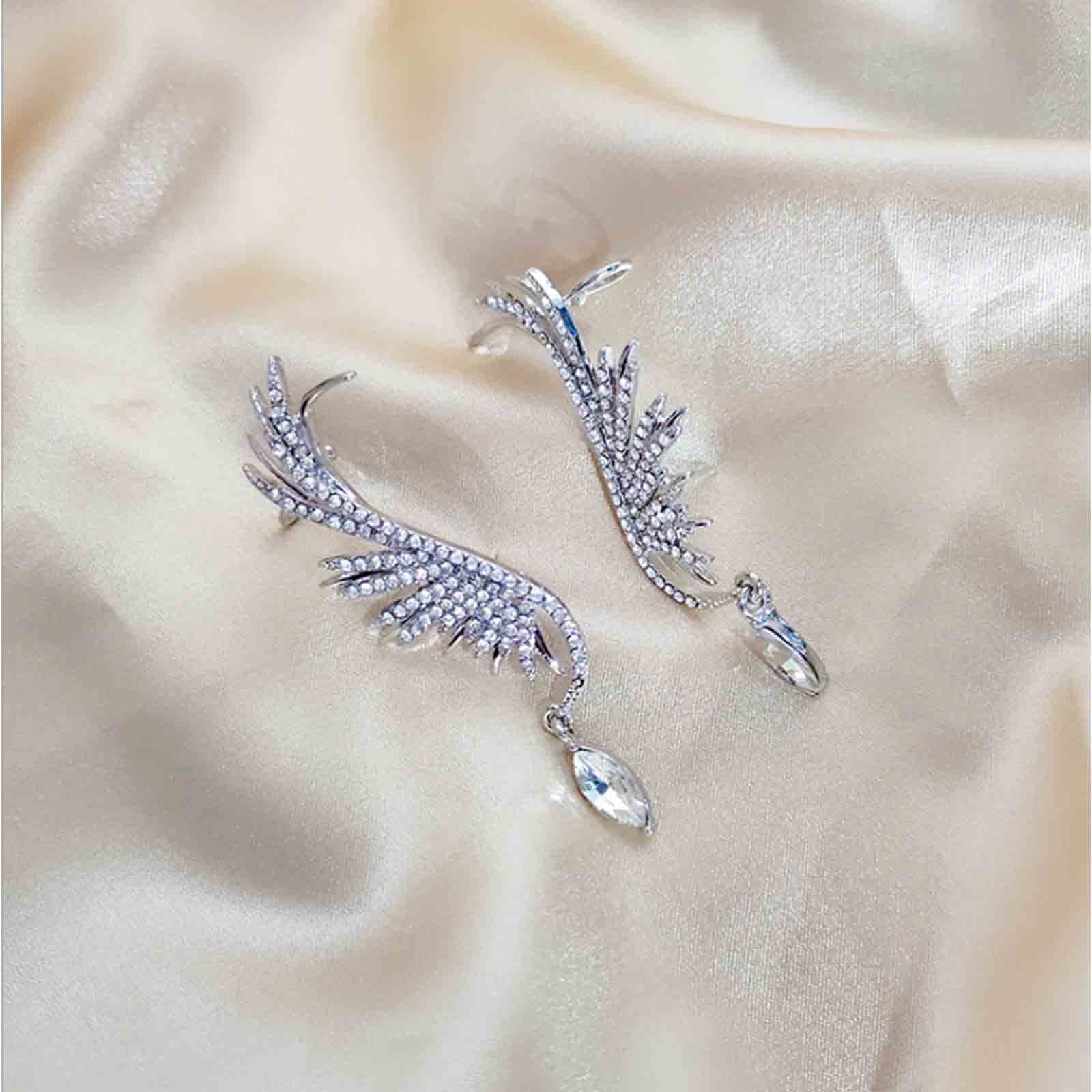 Yheakne Boho Crystal Angel Wing Earrings Silver Rhinestone Wing Earrings Cz Crystal Ear Climber Earrings Guardian Wing Clip on Earrings Jewelry for Women and Girls Gifts