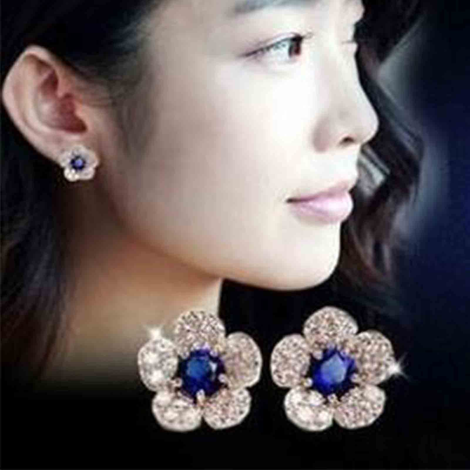 Yheakne Boho CZ Flower Studs Earrings Silver Crystal Earrings Blue Flower Earrings Studs Wedding Earrings Jewelry for Women and Girls
