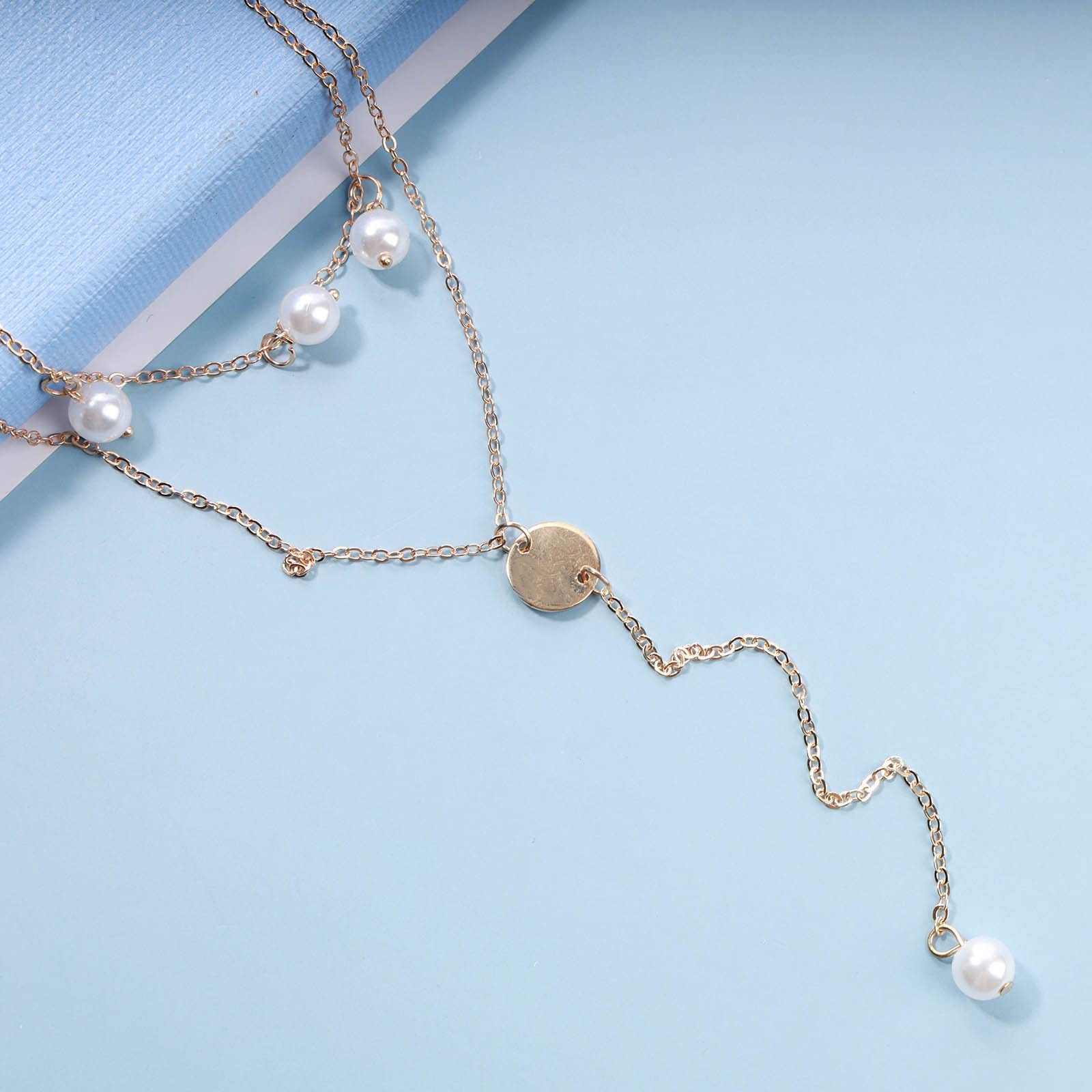 Yheakne Boho Layered Disc Pearl Necklace Gold Coin Pendant Necklace Long Y Lariat Necklace Chain Vintage Pearl Dangle Chain Necklace Jewelry for Women and Girls Gifts