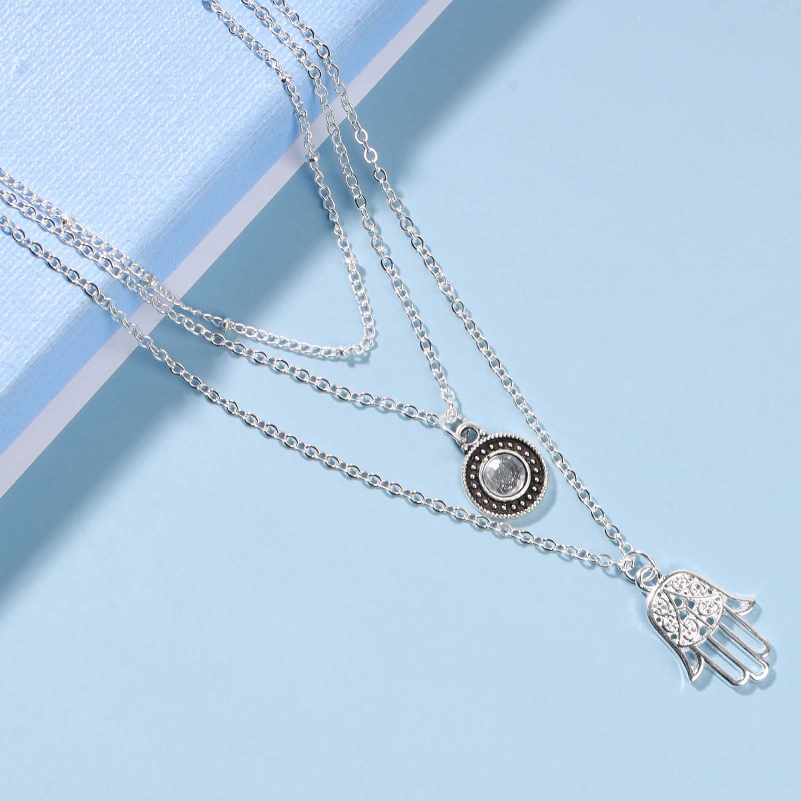 Yheakne Boho Layered Opal Moonstone Necklace Silver Hamsa Pendant Necklace Futian Hand Necklace Chain Opalite Gem Necklace Jewelry for Women and Girls