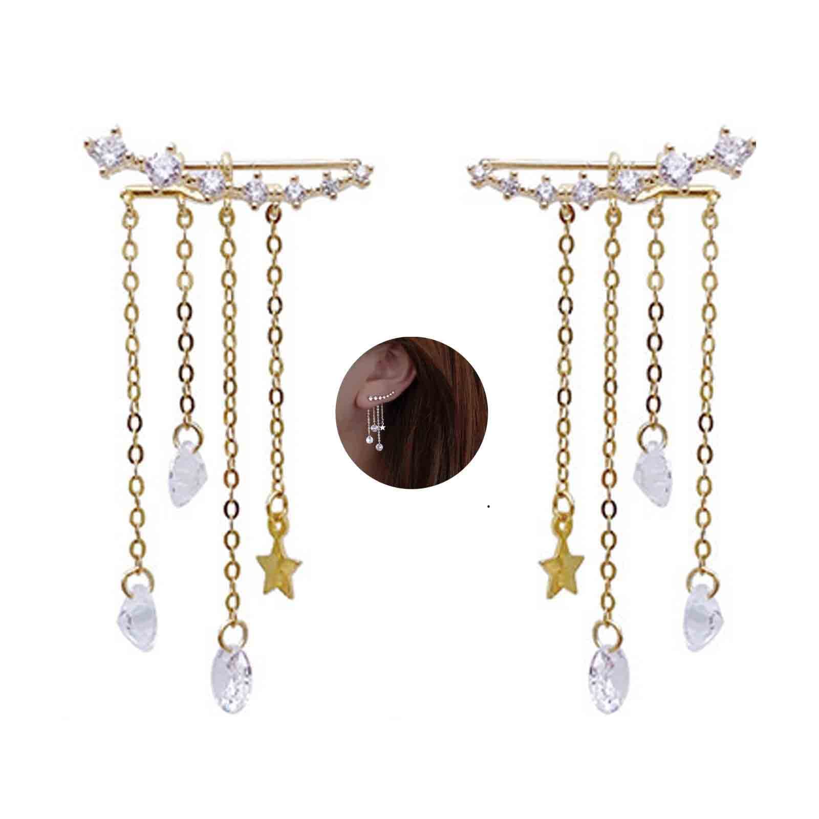 Yheakne Boho Star Ear Jacket Earrings Gold Cz Star Ear Climber Earrings Crystal Chain Tassel Earrings Crystal Ear Crawler Long Chain Earrings Jewelry for Women and Girls Gifts (Gold)