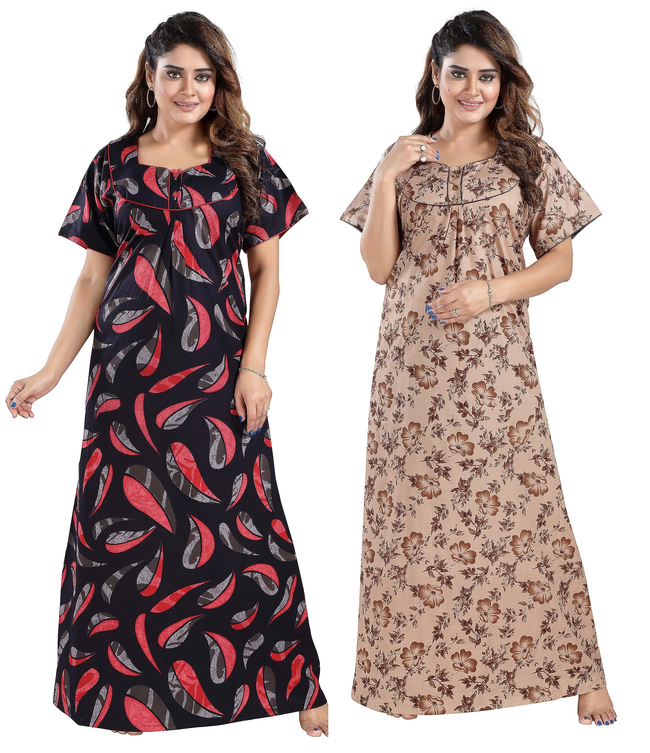 YKI Women &Girls Cotton Fabric Beautiful Print Maxi Nighty, Nightgown, Nightwear, Nightdress With Pocket (Pack Of 2) (X-Large (Bust Size 40") Length-54, Leaf-Red+Flr-Fawn-2508)