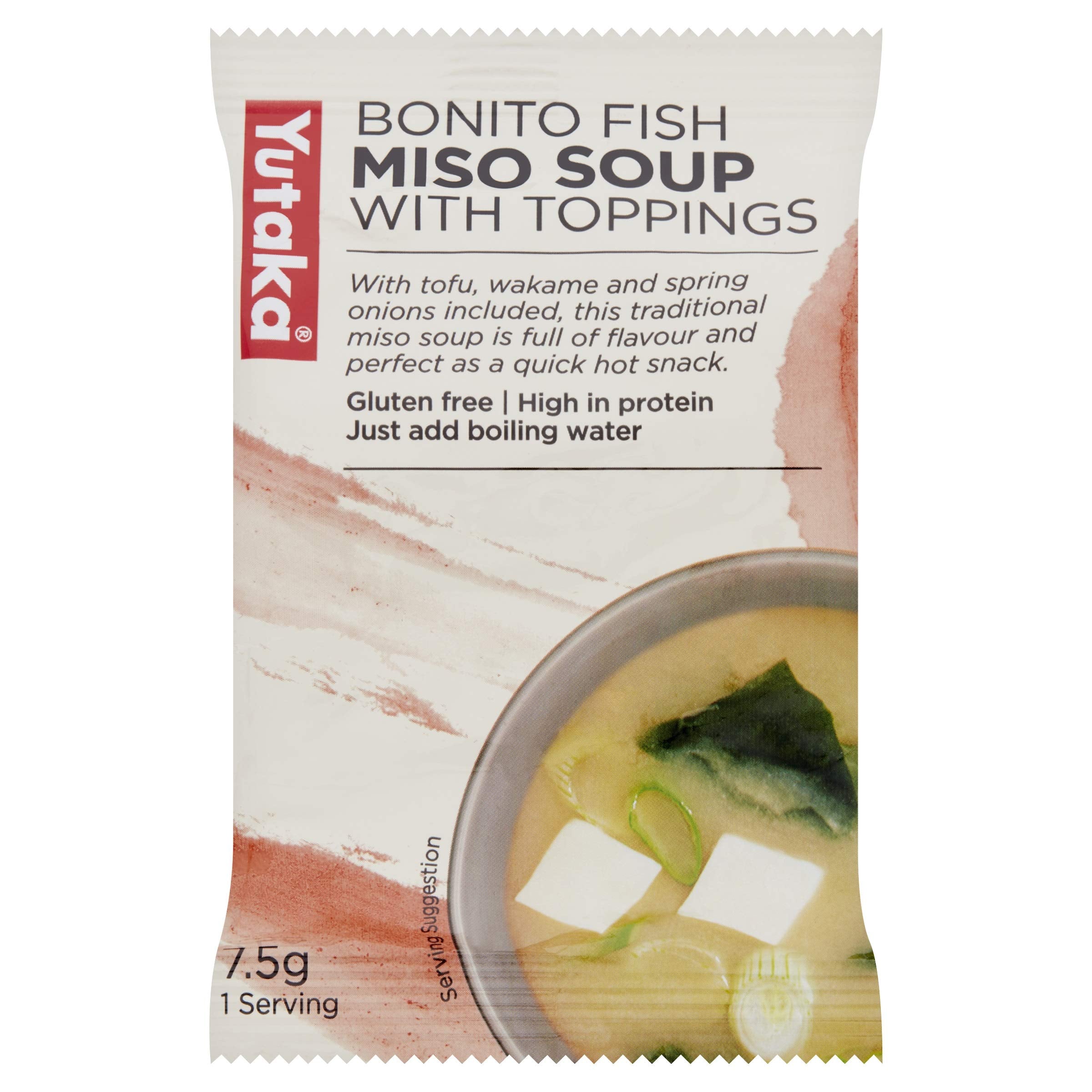 DescriptionProduct DescriptionYutaka Instant Miso Soup - Bonito is a Japanese style freeze-dried soybean paste soup with spring onions, tofu & seaweed.IngredientsSOYBEAN Paste (43%) [SOYBEANS, water, Rice, Salt),Green Onions, Tofu (water, SOYBEANS, Firming Agent: [E516, Corn Starch, Trehalose), Wakame Seaweed, flavor enhancers:E621, E631, E627], potato starch, Bonito powder (katsuwonus pelamis)(1.17%)(FISH), Salt, Kelp extract, yeast extract,Antioxidant: E306. Source of glucoseDirectionsPlace miso block into a cup and add hot water. Be careful with hot water. Stir and serve immediately.Box ContainsEach order comes with Yutaka inst. Miso Soup Bonito 7.5g x 10Manufacturer Contact InformationTazaki Foods ltd., 12 Innova Way, Enfield, EN3 7FL, U.K.