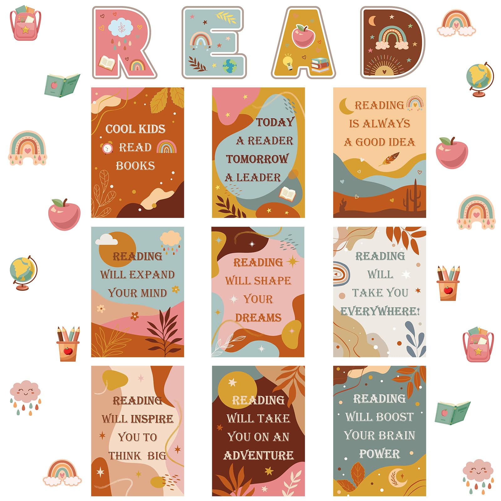 Zonon 45 Pcs Boho Reading Classroom Decorations Read Bulletin Board Set Boho Inspirational Bulletin Board Poster Retro Boho Motivational Bulletin Board Reading Poster Cutouts for Preschool Classroom