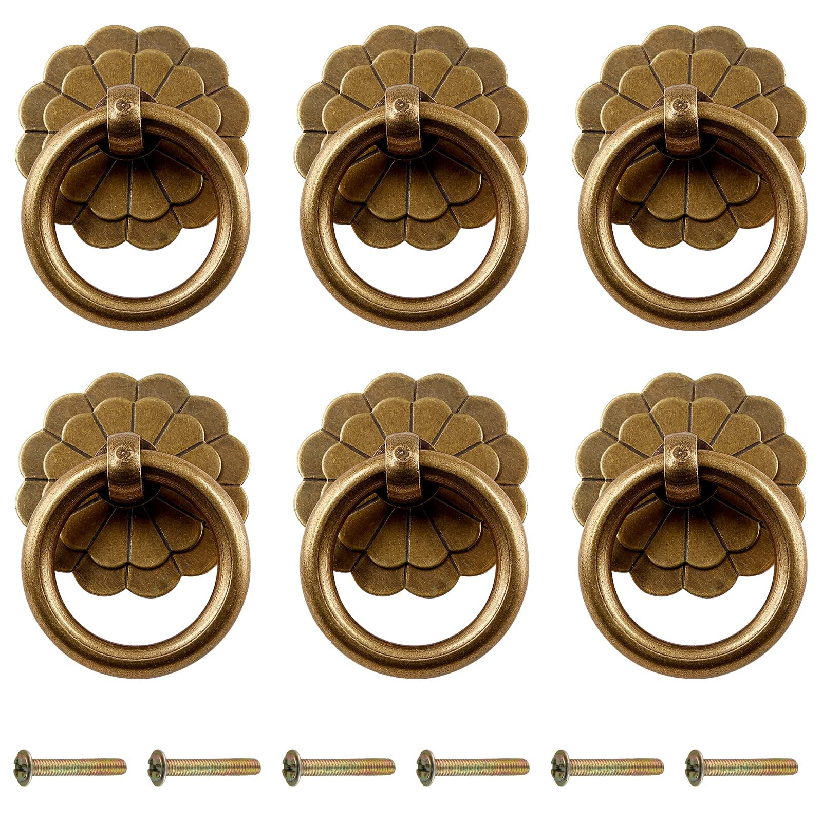 Zorfeter 6Pcs Antique Brass Ring Pulls Vintage Cabinet Small Ring Pulls Knobs Handles for Drawer Closet Cupboard