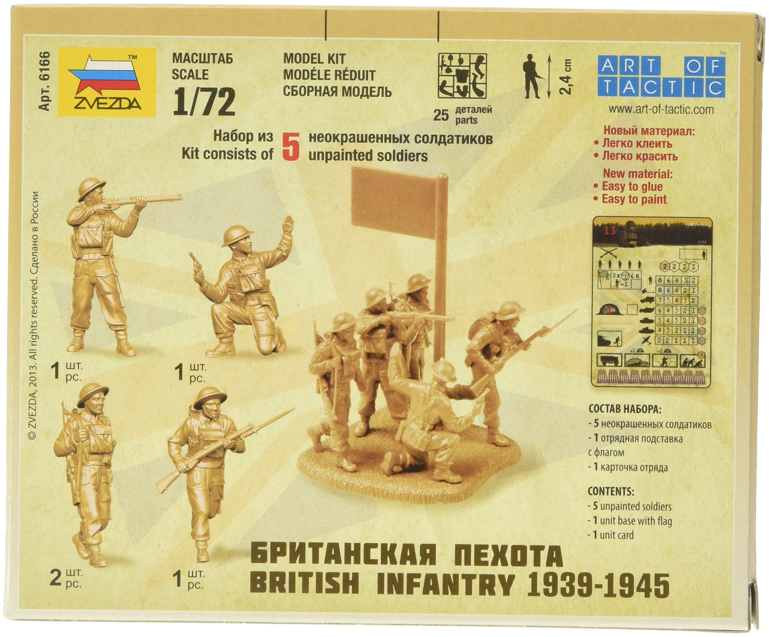 5 unpainted soft-plastic WWII Tommies in action poses. Includes group base, 5 individual bases, gaming flag marker and unit card applicable to 'Art of Tactic' game system. Snap fit - no glue required.